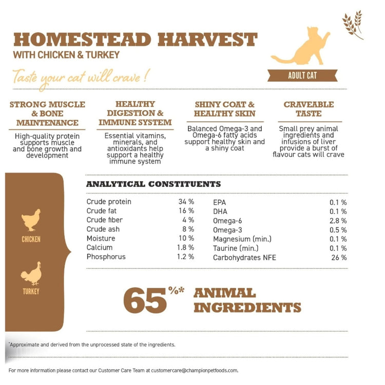 Our ACANA® cat food goes beyond the 1st ingredient™, thoughtfully crafting our recipes from start to finish. Feed your wildcat a diet packed with quality animal ingredients. ACANA® Homestead Harvest recipe is brimming with 65%* quality animal ingredients like free-run chicken and turkey**, delivered fresh or raw+ in their most nourishing form. Artificial colors, flavors or preservatives are never added in our kitchen.