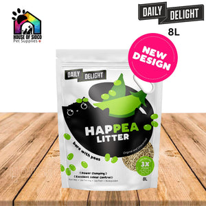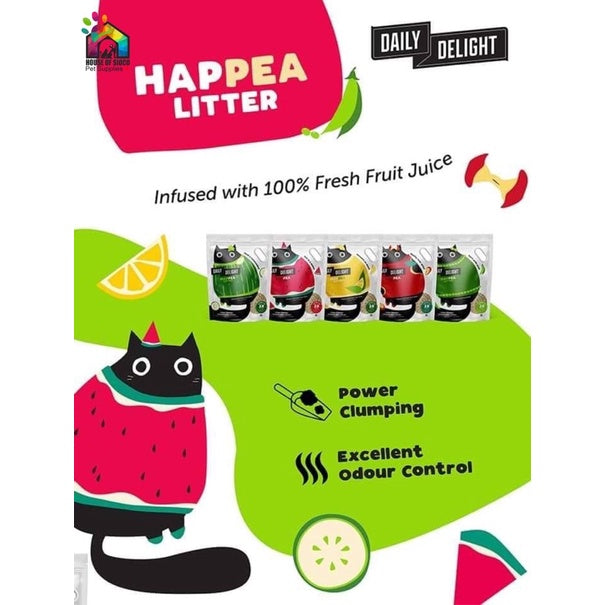 Daily Delight Happea Fiber Litter is made from 100% SUSTAINABILITY - SOURCED PEA FIBRE. Its fast clumping ability creates solid clumps that effectively neutralises odour and absorbs 3x more liquid thank tofu fibre. Our pea litter is infused with fresh fruit extract, keeping the litter pan odour free with a scent that's gentle on the nose.