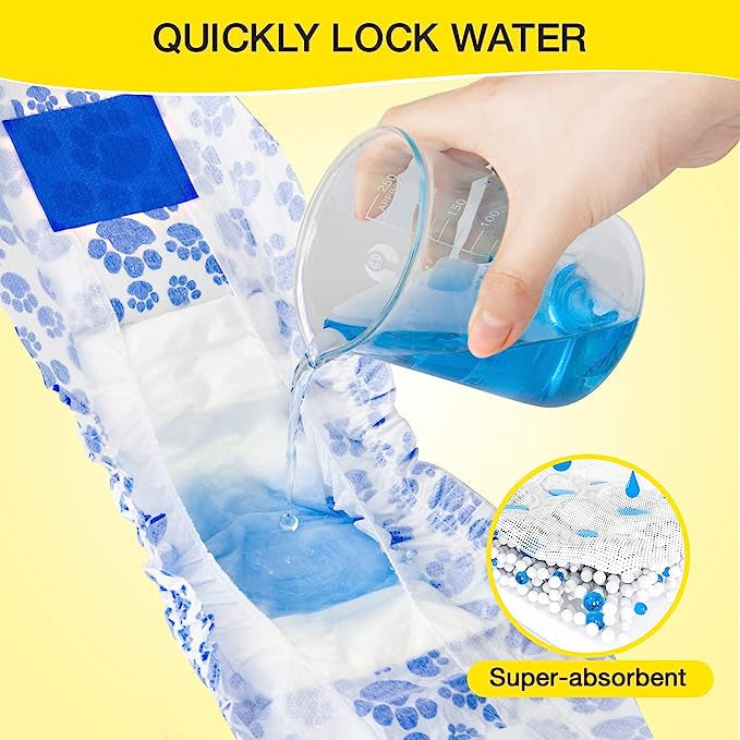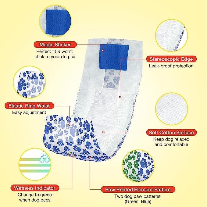 2-In-1 Design: Insides with 2 colors paw pattern male dog diapers, fun and stylish design choice, carry adjustable fasteners and advanced Dry Speed Technology that instantly Converts Urine into Gel.