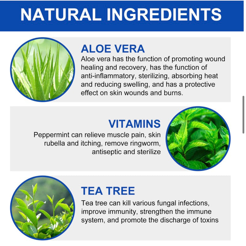 Aloe Vera, Vitamins Peppermint, Tea Tree Oil, Pure water, etc.