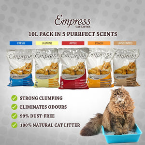Let your feline friend do their business with ease with empress cat litter that safe and gentle on their paws. Its optimized grains have fast clumping, deodorizing and antibacterial action that makes it perfect for hassle-free cleanup. In a fruity scent, cat litter makes cleaning up after your cat easy with continuous odor control and strong clumping.