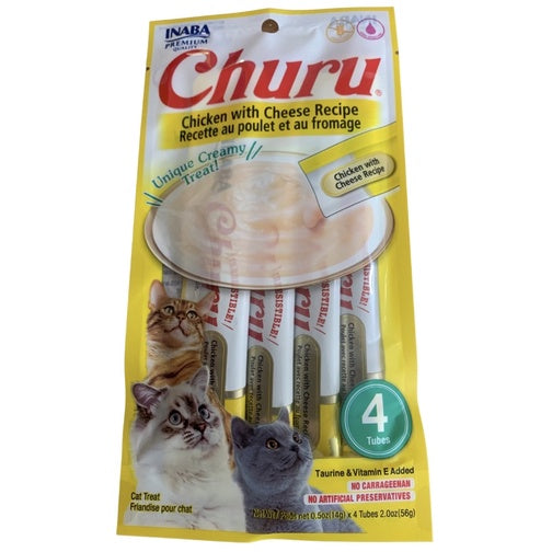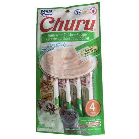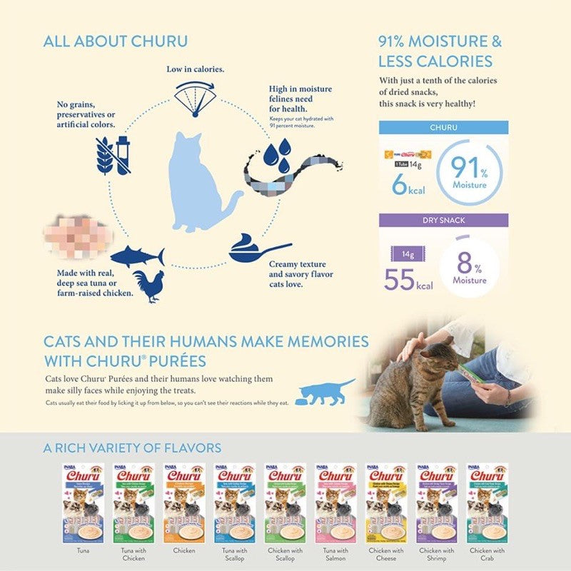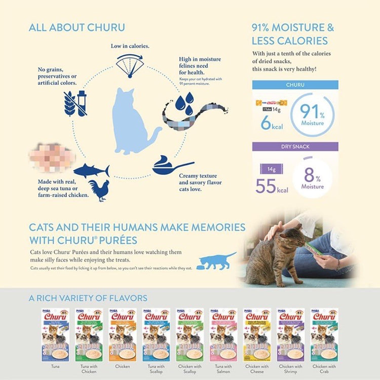 Make your Cat's Day with Churu Purées. Creamy, Lickable & Low Calorie Treats. English Packaging now available.