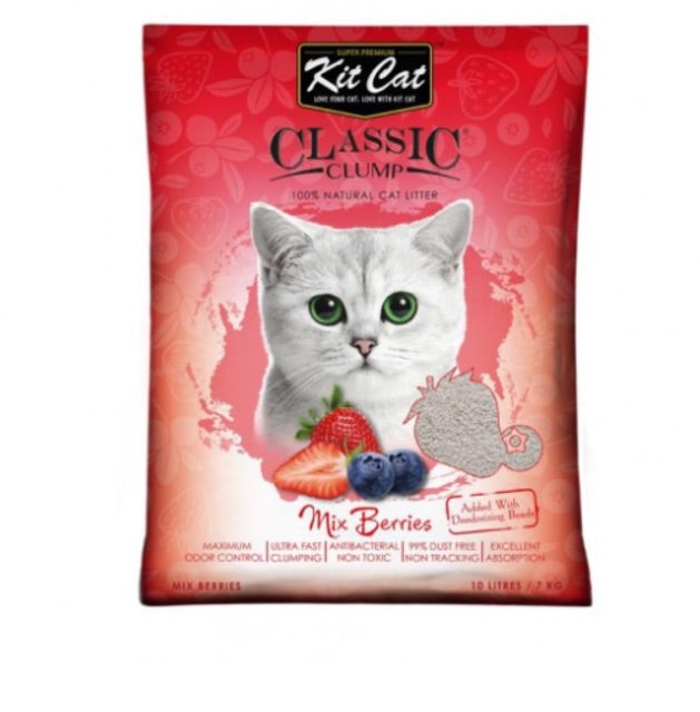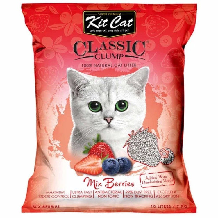 Kit Cat Classic Clump Cat Litter is made from 100% Sodium Bentonite and enhanced with perfume silica beads for superior odor control and maximum moisture absorbency.