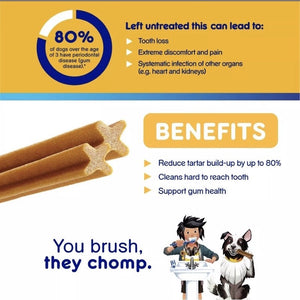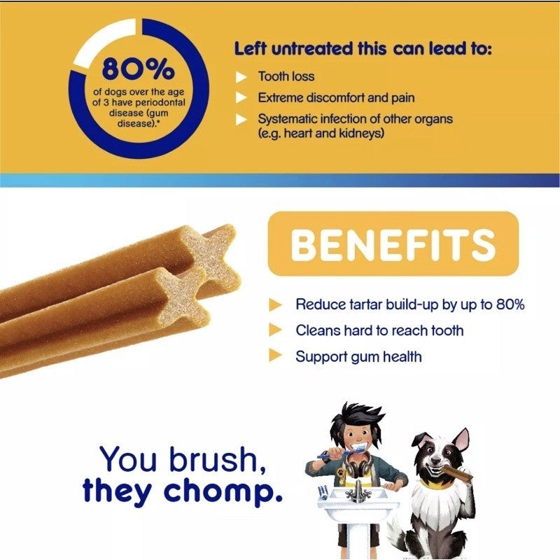 Pedigree Dentastix Original Dog Treats are clinically proven to reduce plaque and tartar buildup—a contributor to gum disease—when used as part of a daily oral care routine. The special texture helps clean down to the gumline. Great for maintaining your dog's dental health, while rewarding them with a tasty treat!