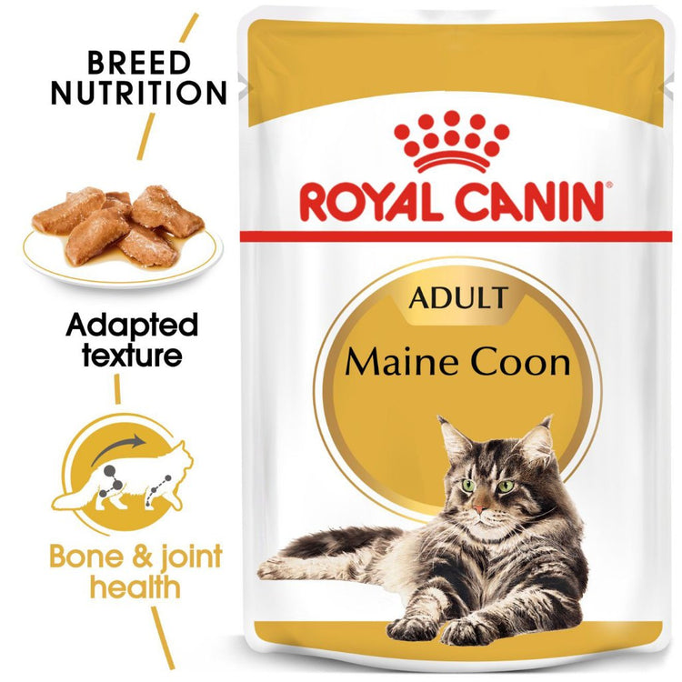 ROYAL CANIN® Maine Coon Adult in Gravy contains an adapted texture with thin slices in gravy to ensure high acceptance specifically for your Maine Coon.