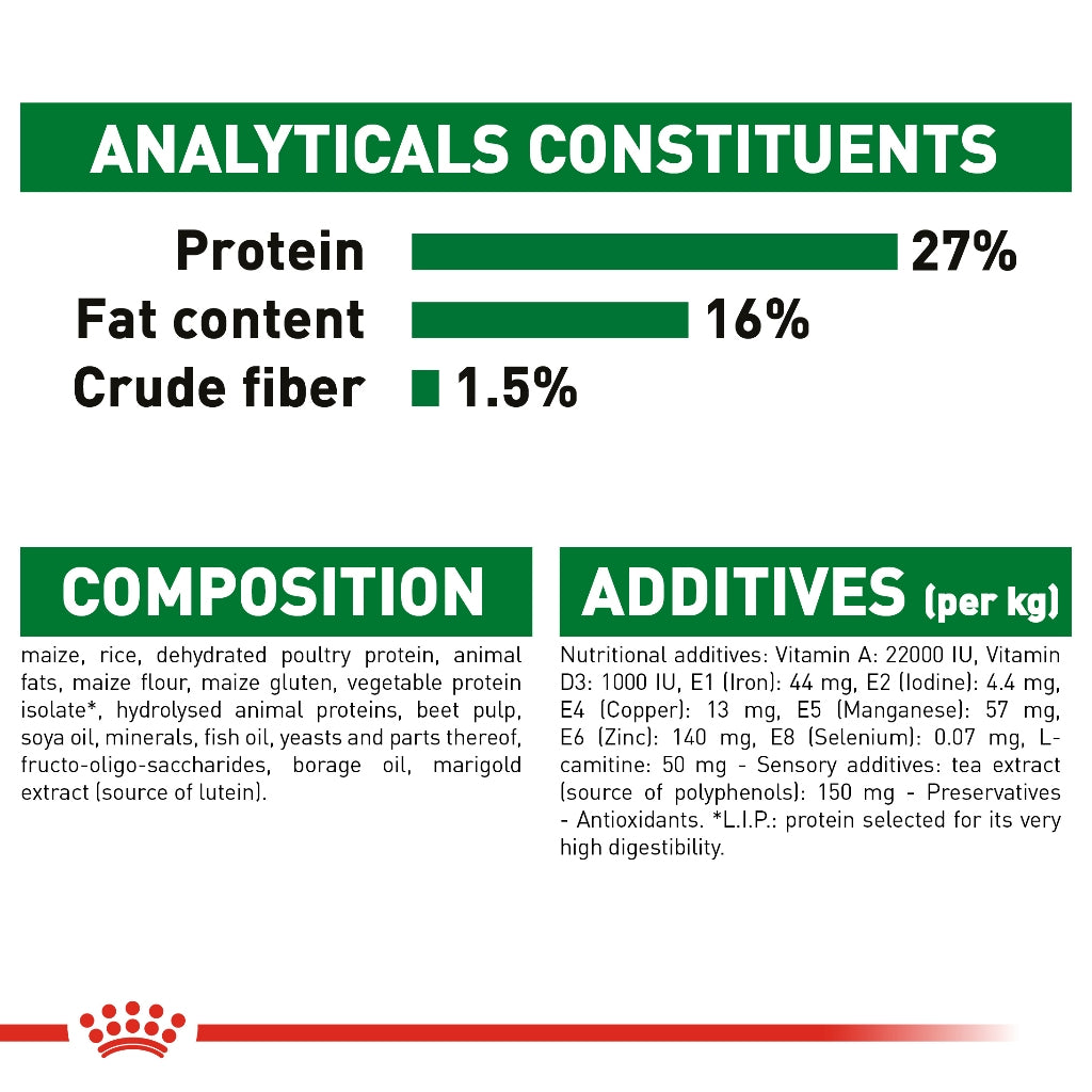 ROYAL CANIN® Mini Adult 8+ has specially adapted content of nutrients to help maintain vitality in small breed dogs facing the first signs of ageing. Contains an exclusive complex of antioxidants to help neutralise free radicals.