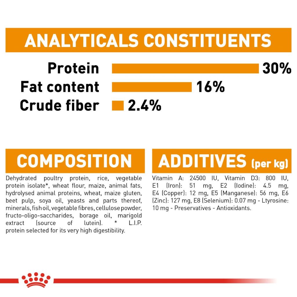 The kibble in ROYAL CANIN® Coat Care Mini contains an exclusive formula high in GLA-rich borage oil, which gives extra nourishment to the skin and hair. While tyrosine & phenylalanine are melanin precursors that work to intensify the colour of your dog's coat.
