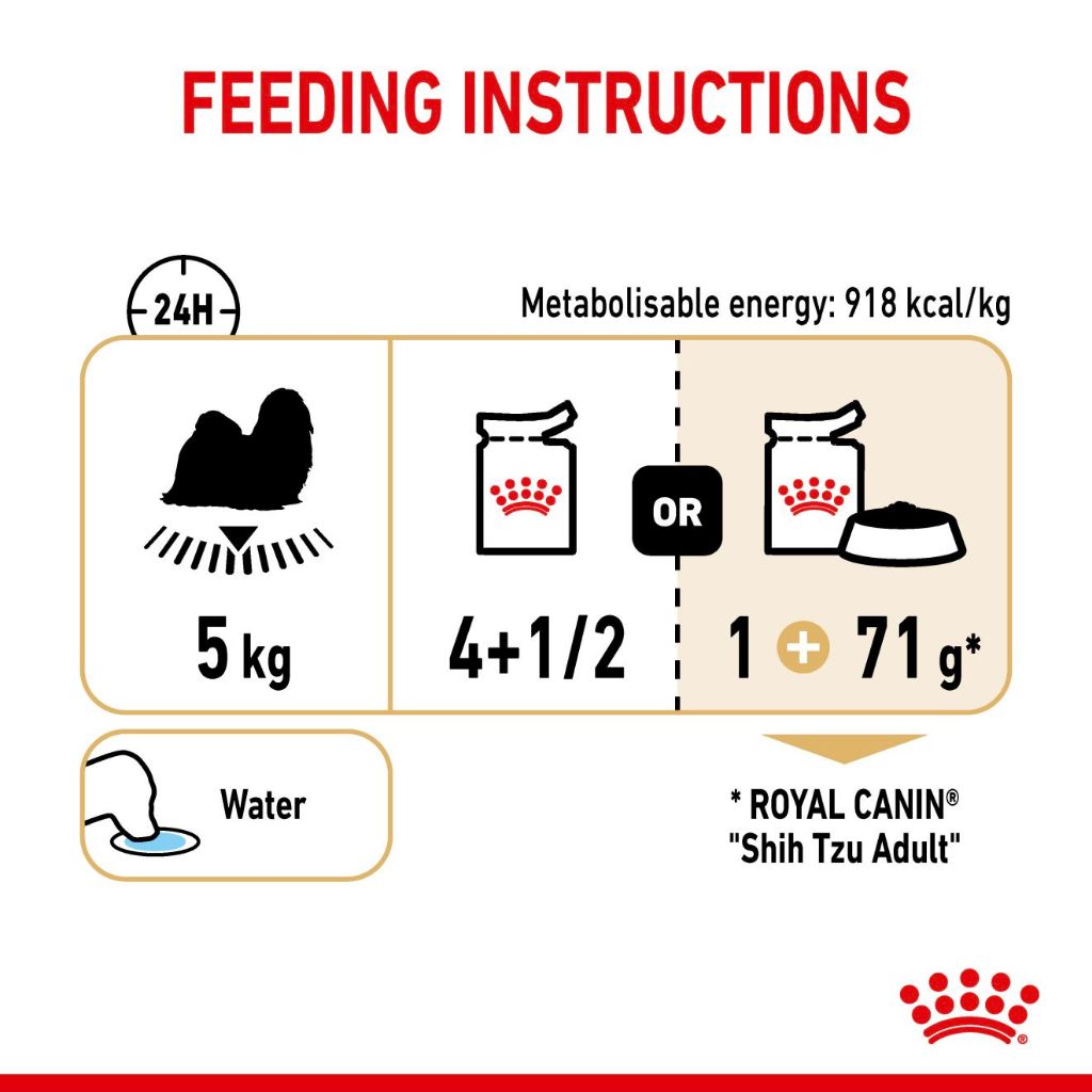 Specially for Shih Tzu adult dogs over 10 months old. ROYAL CANIN® Shih Tzu Adult Loaf wet food is specially formulated with all the nutritional needs of your adult Shih Tzu in mind. The formula contains an exclusive combination of nutrients that help maintain your dog’s skin health – which in turn positively affects the health of its coat. This formula includes the omega-3 fatty acids EPA and DHA, as well as an enrichment of borage oil; these fatty acids play a large role in helping to nourish your dog’s skin and coat.