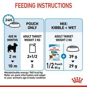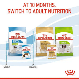 ROYAL CANIN® X-Small Puppy in Gravy wet food is specially formulated to support the nutritional needs of extra small breed puppies. This formula is suitable for 2 to 10-month-old puppies that should reach an adult weight of up to 4 kg.