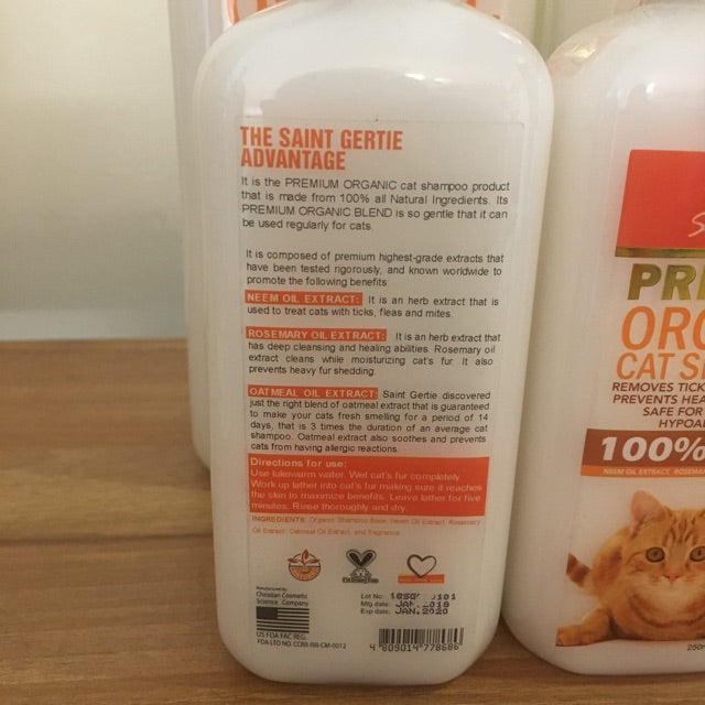 OATMEAL OIL EXTRACT: Widely used in cat shampoo as the most effective deodorizing agent. Saint Gertie discovered just the right blend of oatmeal extract that is guaranteed to make your cats fresh smelling for a period of 14 days, that is 3 times the duration of an average cat shampoo. Oatmeal extract also soothes and prevents cats from having allergic reactions.