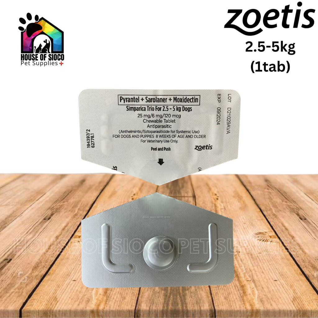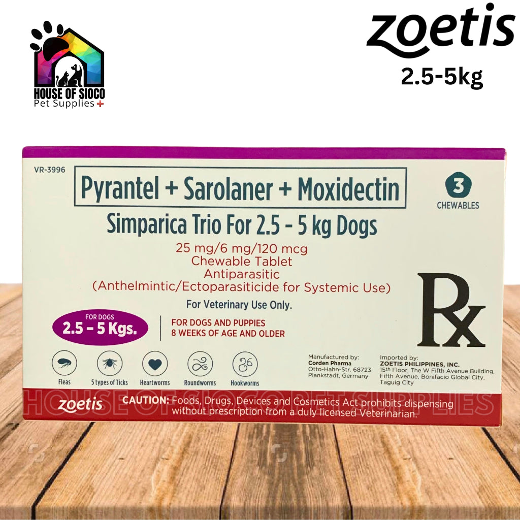 Indications:(Pyrantel + Sarolaner+Moxidectin) SIMPARICA TRIO prevents heartworm disease caused by Dirofilaria immitis, kills adult fleas (Ctenocephalides felis) and is indicated for the treatment and prevention of flea infestations, the treatment and control of tick infestations with Amblyomma americanum (lone star tick), Amblyomma maculatum (Gulf Coast tick), Dermacentor variabilis (American dog tick), ixodes scapularis (black-legged tick), and Rhipicephalus sanguineus (brown dog tick), and the treatment and control of the roundworm (immature adult and adult Toxocara cans and adult Toxascaris leonina) and adult hookworm (Ancylostoma caninum and Uncinaria stenocephala) infections for one month in dogs and puppies 8 weeks of age and older, and weighing more than 1.2 kg.