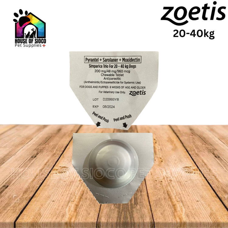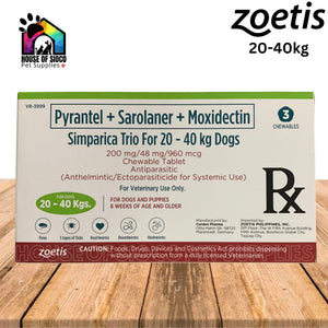 Indications:(Pyrantel + Sarolaner+Moxidectin) SIMPARICA TRIO prevents heartworm disease caused by Dirofilaria immitis, kills adult fleas (Ctenocephalides felis) and is indicated for the treatment and prevention of flea infestations, the treatment and control of tick infestations with Amblyomma americanum (lone star tick), Amblyomma maculatum (Gulf Coast tick), Dermacentor variabilis (American dog tick), ixodes scapularis (black-legged tick), and Rhipicephalus sanguineus (brown dog tick), and the treatment and control of the roundworm (immature adult and adult Toxocara cans and adult Toxascaris leonina) and adult hookworm (Ancylostoma caninum and Uncinaria stenocephala) infections for one month in dogs and puppies 8 weeks of age and older, and weighing more than 1.2 kg.