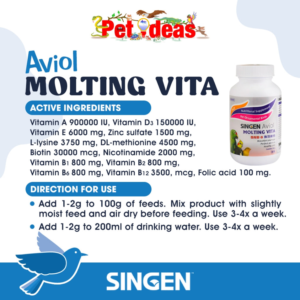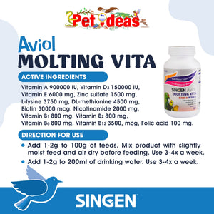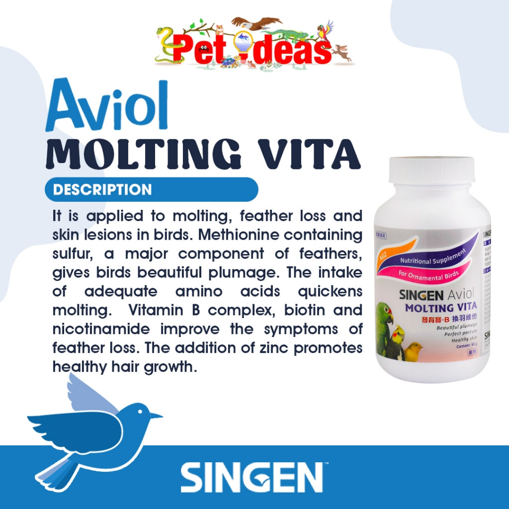MOLTING VITA is applied to molting, feather loss and skin lesions in birds. Methionine containing sulfur, a major component of feathers, gives birds beautiful plumage. The intake of adequate amino acids quickens molting. Vitamin B complex, biotin and nicotinamide improve the symptoms of feather loss. The addition of zinc promotes healthy hair growth.