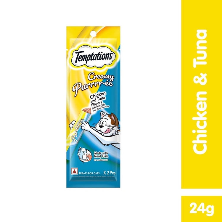 Your feline friend is going to enjoy the delicious taste of TEMPTATIONS Creamy Purrrr-ée Cat Treats. These TEMPTATIONS cat treats are flavorful and creamy, with a texture your cat won't be able to resist. Plus, this is a low-calorie pet treat that is nutritionally complete for your adult cat. So just open, squeeze, and serve!