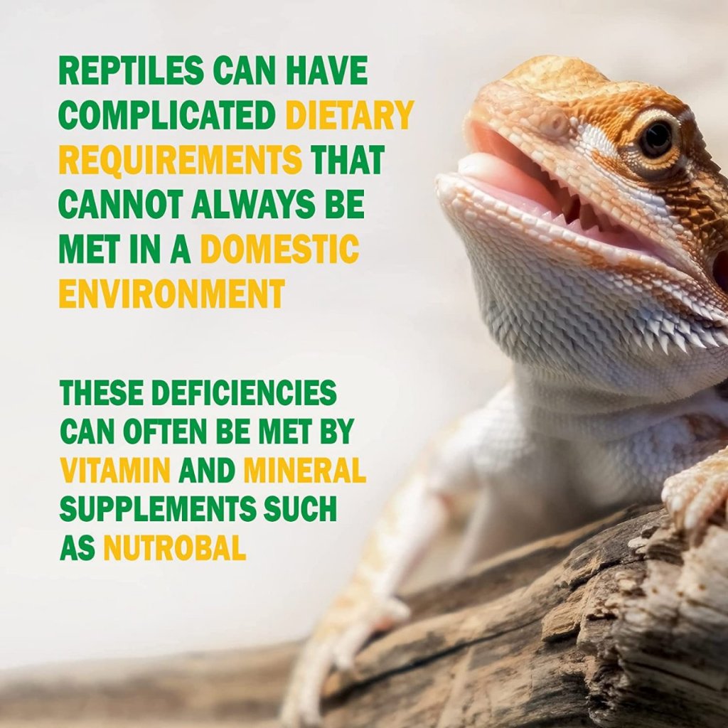 Reptiles can have complicated dietary requirements that can’t always be met in a domestic environment, but in most instances these deficiencies can be met by vitamin and mineral supplements. Nutrobal comes in powder form that can easily be added to the food, including being dusted onto live food such as crickets, locusts and mealworms for insectivores, and will optimise the health of your pet reptile when given at the correct doses.