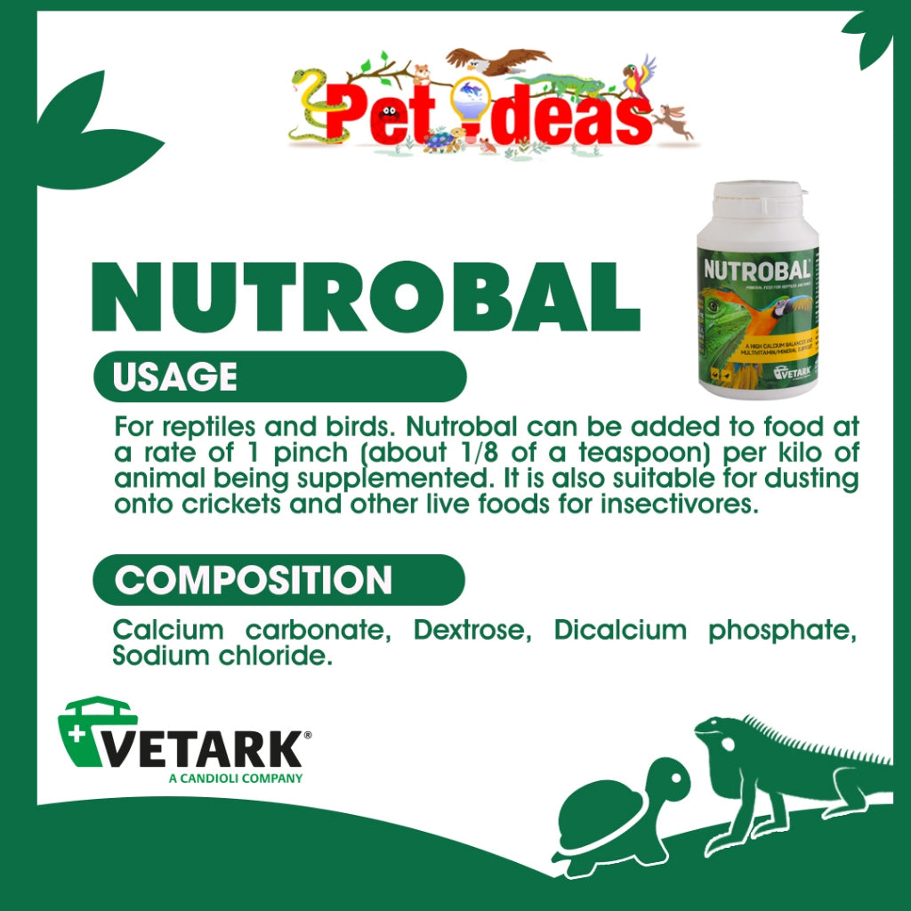 Calcium deficiencies occur readily in exotic species such as reptiles and birds. Nutrobal is a vitamin and mineral feeding stuff providing a high potency calcium source. Nutrobal also contains vitamin D3 in sufficient levels to mobilise the calcium provided.